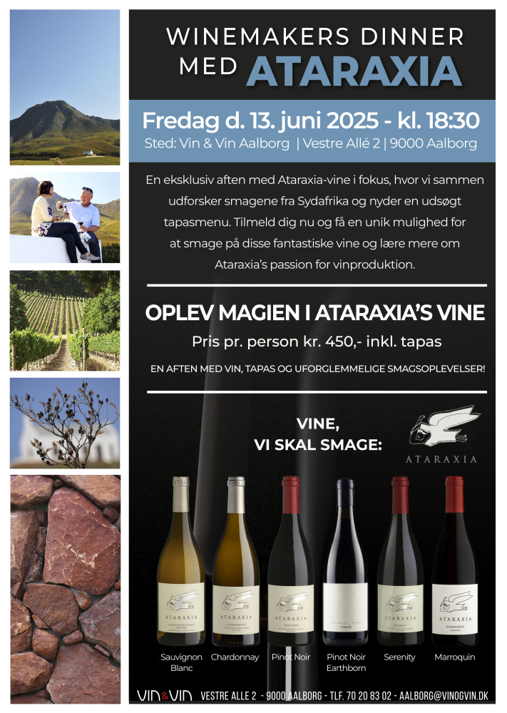 Vin & Vin Aalborg inviterer til en eksklusiv Winemakers Dinner med Ataraxia, hvor vi udforsker nogle af Sydafrikas mest elegante vine. Arrangementet finder sted fredag den 13. juni 2025 kl. 18.30 i vores butik på Vestre Alle 2 i Aalborg.