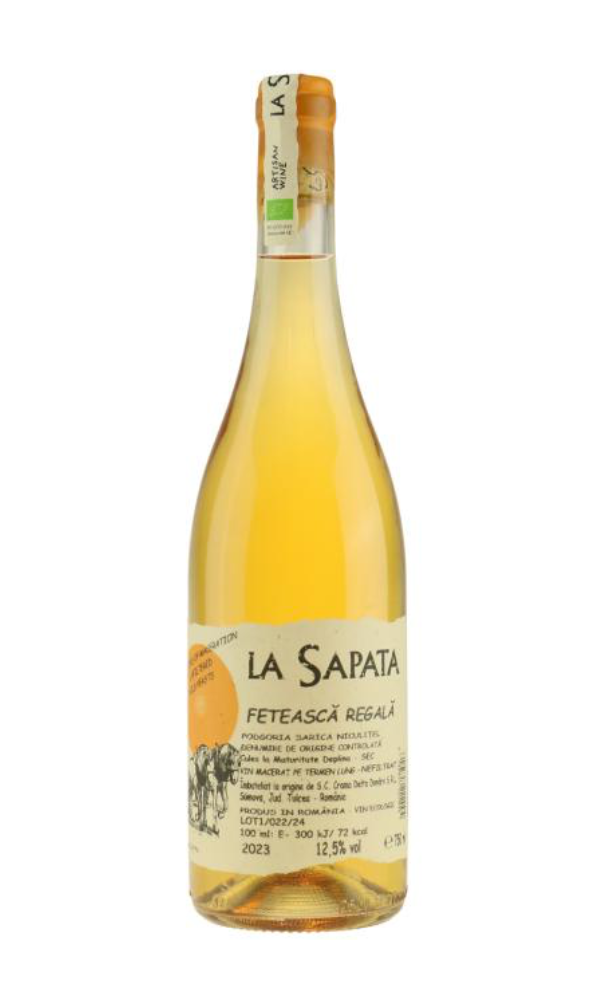 En af Rumæniens mest lovende druesorter hedder Feteasca Regala. Det betyder ordret oversat Den Royale Jomfru. Sorten har vist stor alsidighed og er i stand til både at levere utroligt charmerende hvidvine, der er beregnet på at blive drukket unge, og den kan levere mere robuste, ambitiøse hvidvine, der kan udvikle sig positivt i kælderen gennem adskillige års lagring. Denne alsidighed udforsker La Sapata yderligere med vinen her, der er en orangevin lavet på Feteasca Regala.