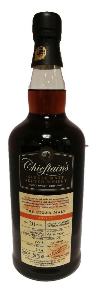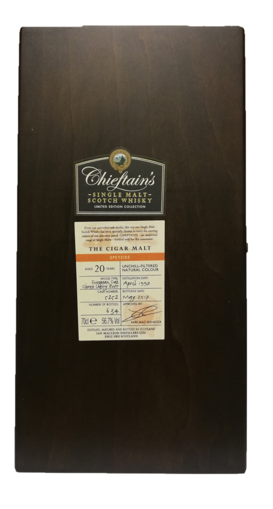 Single malt Scotch whisky fra et ikke afsløret destilleri i Speyside-regionen, uafhængigt aftappet af Ian Macleod til Chieftain's. Dette udtryk blev destilleret i april 1997 og overlod til alder i 20 år i en enkelt Oloroso-sherry-røv indtil maj 2017. Det har fået navnet The Cigar Malt, så hvis du nyder en cigaret- og whiskyparring, burde dette være perfekt til dig . 634 flasker blev produceret.